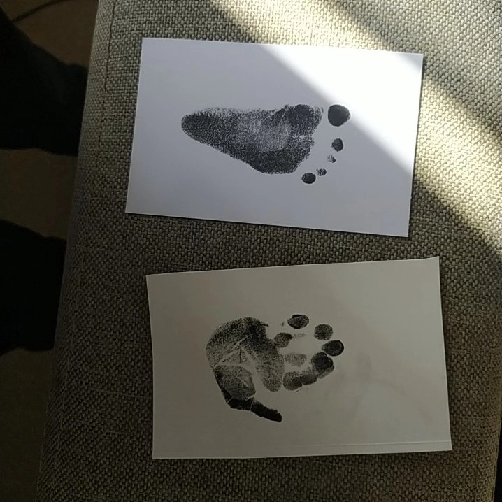 - NIEBRUDZĄCY TUSZ - malutki odcisk Twojego dziecka pozostanie na białej karcie a dzidziuś pozostanie czysty! Dzięki temu ciemnemu tuszowi uzyskasz perfekcyjnie szczegółowy odcisk dłoni i stopy dziecka.