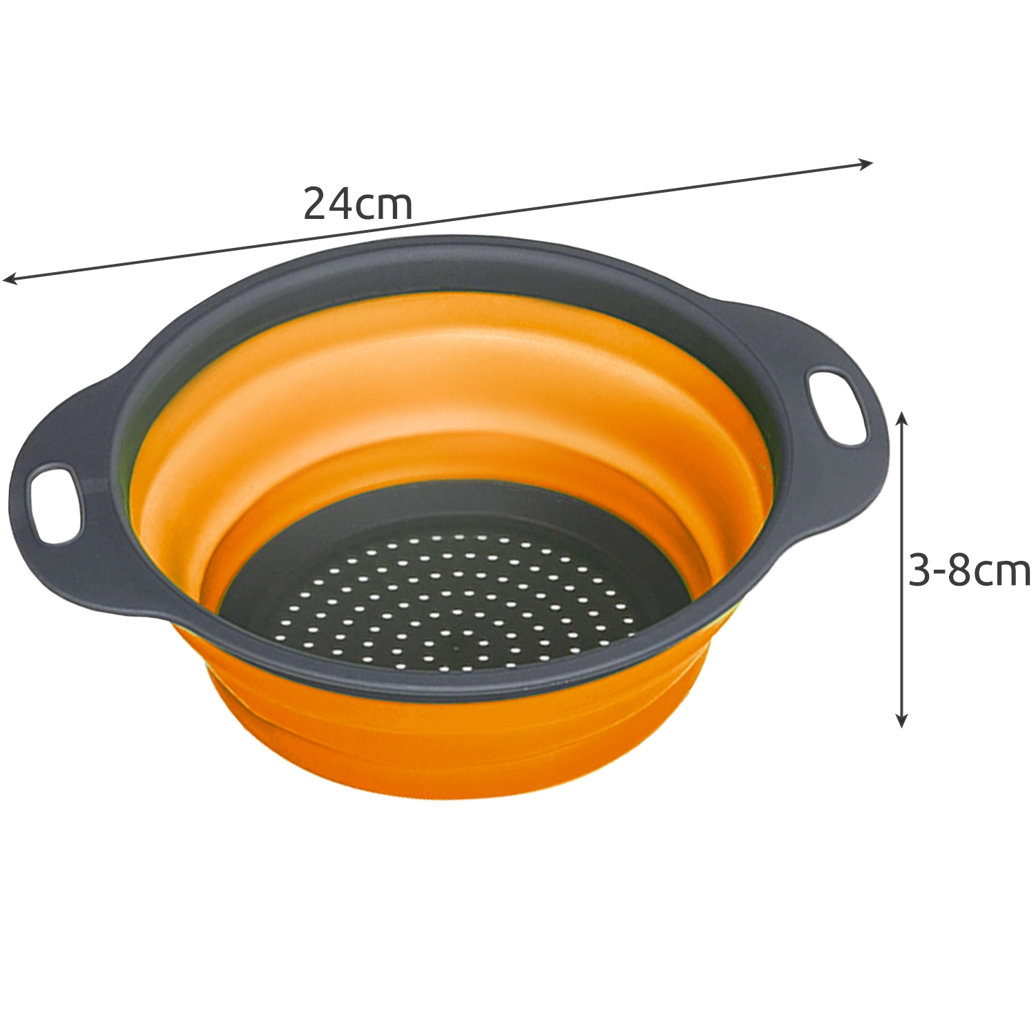 - SPECYFIKACJA - kolor: szaro / pomarańczowy; materiał: tworzywo sztuczne / silikon; temperatura w jakiej można go użytkować to -10 do 80 ℃; średnica spodu: 11 cm; średnica rantu: 19 cm; wymiary po złożeniu: 24 x 3 cm; wymiary po rozłożeniu: 24 x 8 cm; waga: 109 g; waga w opakowaniu: 111g.