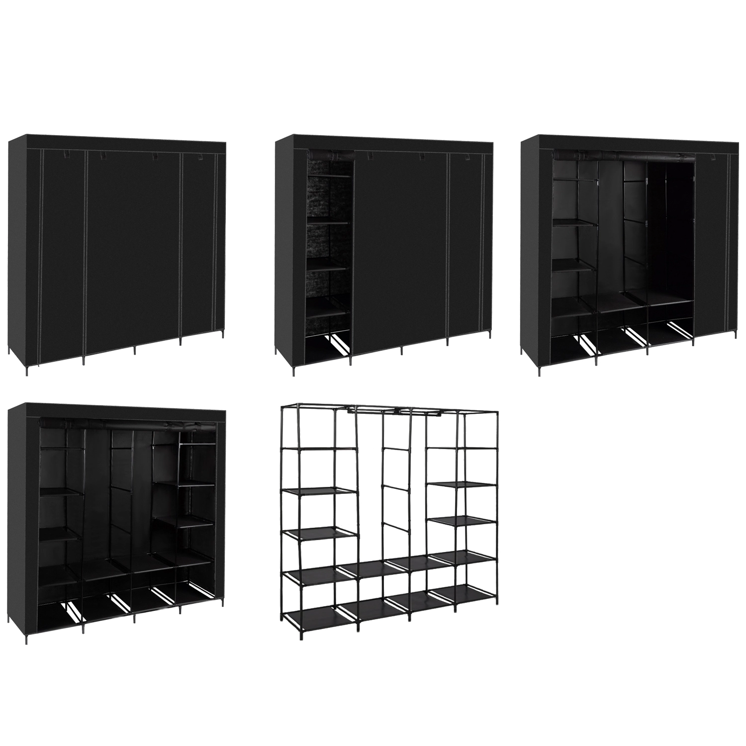 - SPECYFIKACJA - kolor: czarny; materiał zewnętrzny: włóknina, konstrukcja: żelazo, półki: włóknina, pozostałe: PP; ilość półek: 14; ilość drzwi: 3; ilość drążków do wieszania: 2; maksymalne obciążenie: 40 kg; wymiary: 170 x 42 x170 cm; waga: 4 kg; waga w opakowaniu: 4,55 kg.