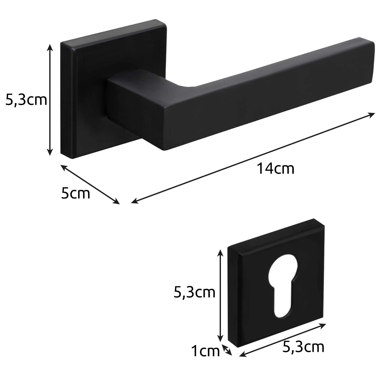 - SPECYFIKACJA - kolor: czarny mat; materiał: żelazo + aluminium; do drzwi: wewnętrznych; wymiar klamki: 5,3 x5 x 14 cm; wymiar rozety: 5,3 x 5,3 x 1 cm; waga: 440 g; waga w opakowaniu: 486 g.
