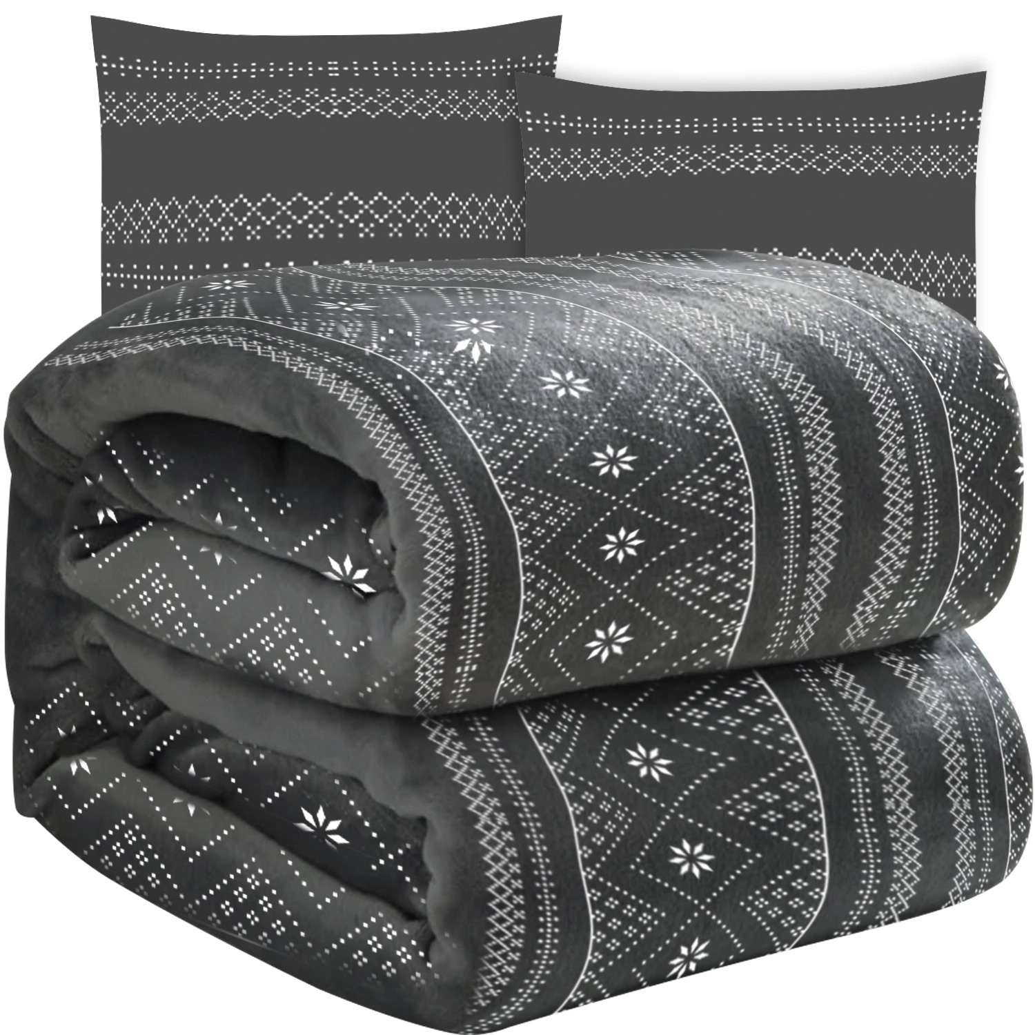 MIĘKKI CIEPŁY KOC Z POSZEWKAMI NA JAKŚKI W SZARYM KOLORZE Z ZIMOWYM MOTYWEM
