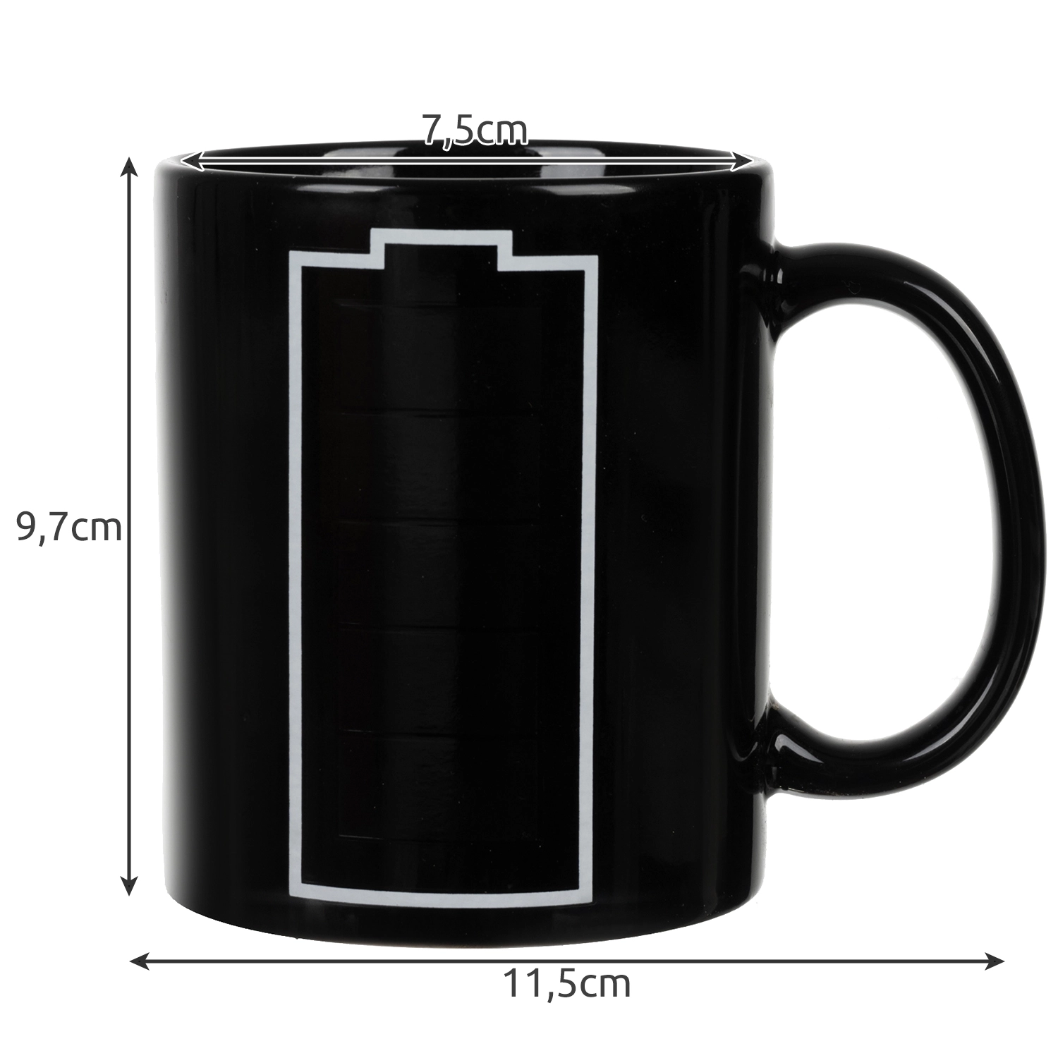 - WYSOKA JAKOŚĆ - ten elegancki czarny kubek, posiada optymalną pojemność 330 ml. Wykonany jest z ceramiki dopuszczonej do kontaktu z żywnością i napojami. Nie zawiera żadnych substancji szkodliwych, które mogłyby się przedostać do cieczy. Termoczuła farba, zmienia kolor na zielony podczas oddziaływania na nią gorącym napojem lub wodą. Ceramika z jakiej został wykonany kubek długo utrzymuje płyn w wysokiej temperaturze. Dzięki symbolowi baterii, można zaobserwować kiedy napój zaczyna się ochładzać. Wygodne, duże ucho zapewnia stabilny i mocny chwyt kubka.
