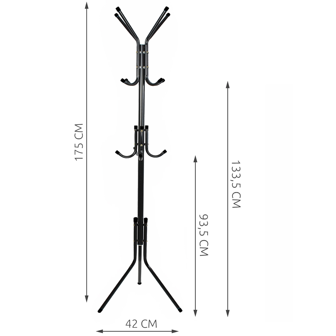 - SPECYFIKACJA - kolor: czarny; materiał: metal; wymiary: 42 x 42 x 175 cm; wysokość poziomu haków (niski/średni/wysoki): 93,5/133,5/175cm; waga wieszaka: 1,556 kg; waga z opakowaniem: 1,623 kg.