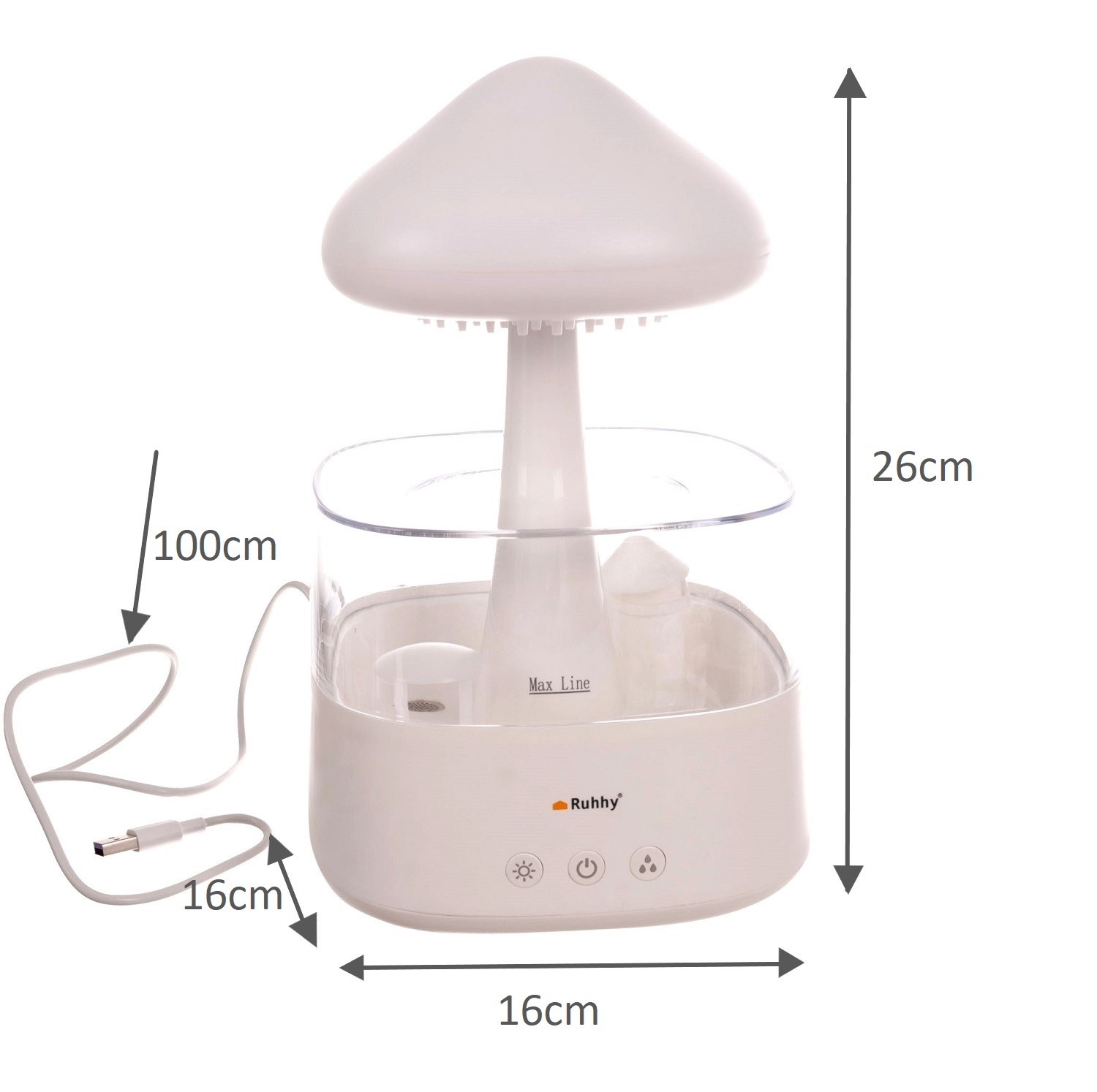 - SPECYFIKACJA – kolor: biały; materiał: PP, pozostałe: PC + silikon + stal nierdzewna + ABS; moc: 10 W; efekt deszczu: tak; nawilżanie: tak; pojemność: 450 ml; 8 kolorów świecenia; ilość LED: 6; antypoślizgowa obręcz z silikonu pod spodem: tak; długość przewodu zasilającego: 100 cm; wymiary: 26 x 16 x 16 cm; waga: 0,6 kg; waga w opakowaniu: 1,2 kg.