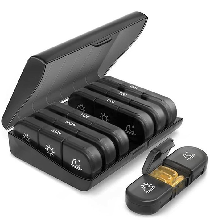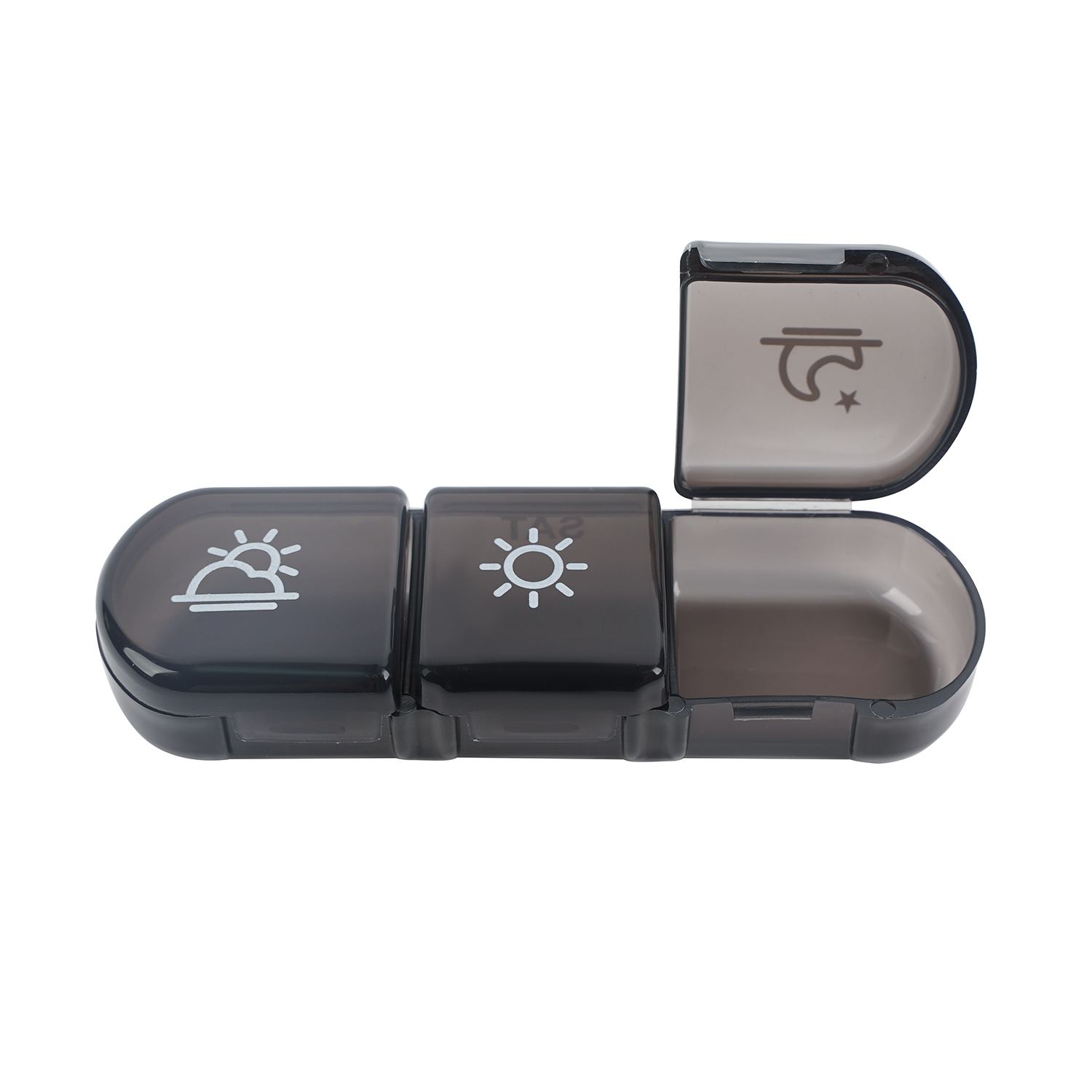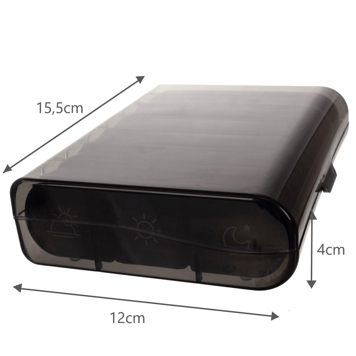 - SPECYFIKACJA - kolor: czarny; materiał: PP; tygodniowy: tak; 3 pory dnia: tak; wymiary całkowite: 15,5 x 12 x 4 cm; waga: 0,2 kg; waga w opakowaniu: 0,253 kg.