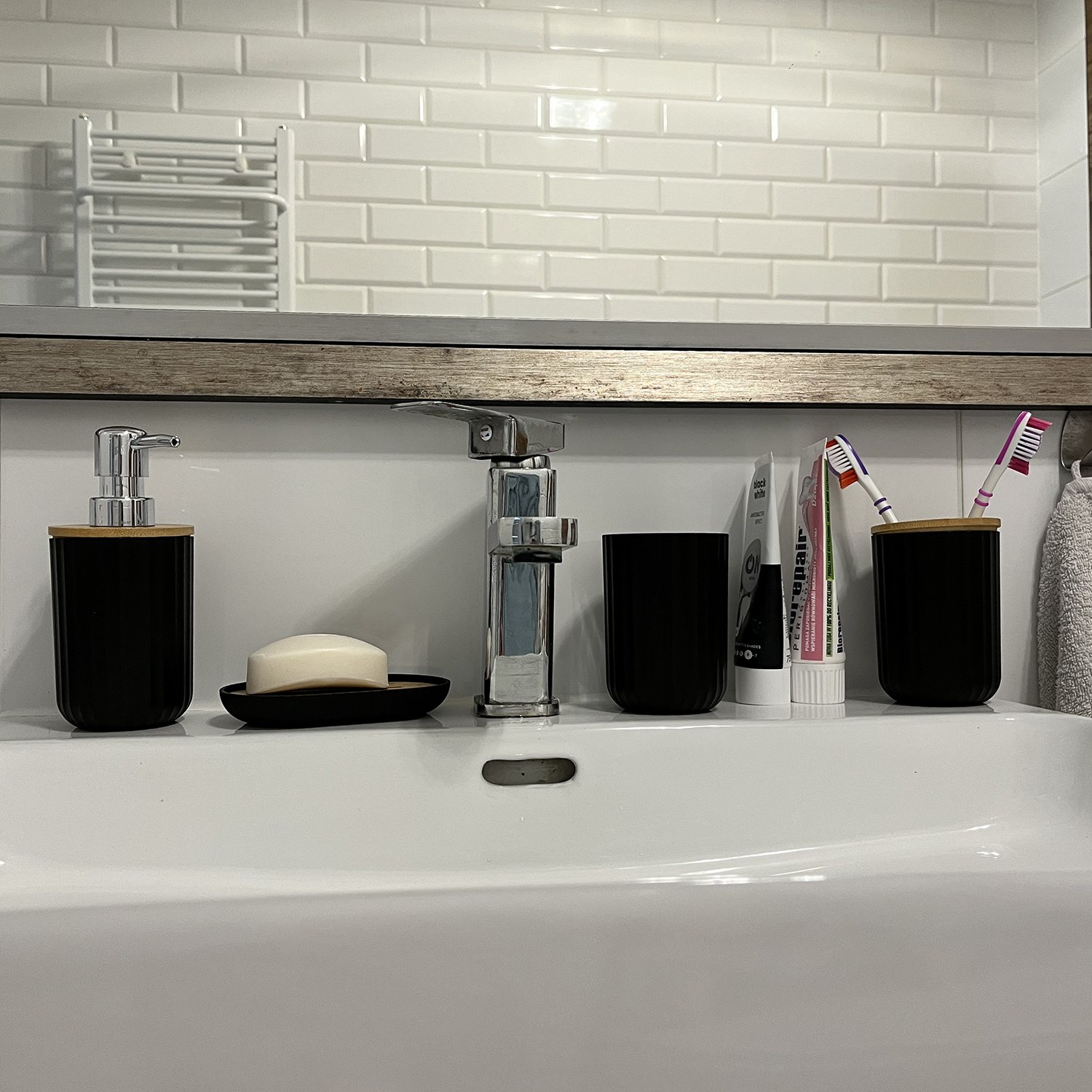 - KUBEK NA SZCZOTECZKI I KUBEK DO PŁUKANIA UST - w zestawie znajdują się dwa kubki – jeden przeznaczony do płukania ust podczas mycia zębów, a drugi do przechowywania szczoteczek do zębów. Kubek na szczoteczki jest wyposażony w bambusową nakładkę z dwoma dużymi otworami, które ułatwiają odseparowanie szczoteczek, zapobiegając ich stykaniu się. Oba kubki charakteryzują się eleganckim, czarnym wykończeniem z karbowaną powierzchnią, które nadają im nowoczesny wygląd.