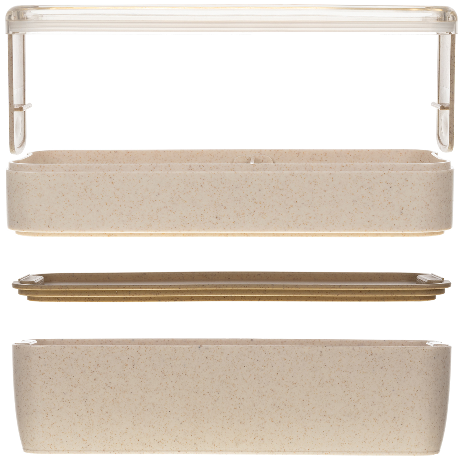- FUNKCJONALNY PODZIAŁ NA DWA POJEMNIKI - lunchbox składa się z dwóch osobnych pojemników, które pozwalają na przechowywanie różnych potraw bez ich mieszania. Dolny pojemnik o pojemności 400 ml jest idealny na większe dania, jak sałatki czy dania główne. Oddzielona tacką górna część zawiera mniejszy pojemnik o pojemności 350 ml. Dzięki takiemu układowi, potrawy pozostają świeże, a ich smak i aromat nie przenikają się nawzajem. Tacka oddzielająca pojemniki pełni również funkcję talerza.