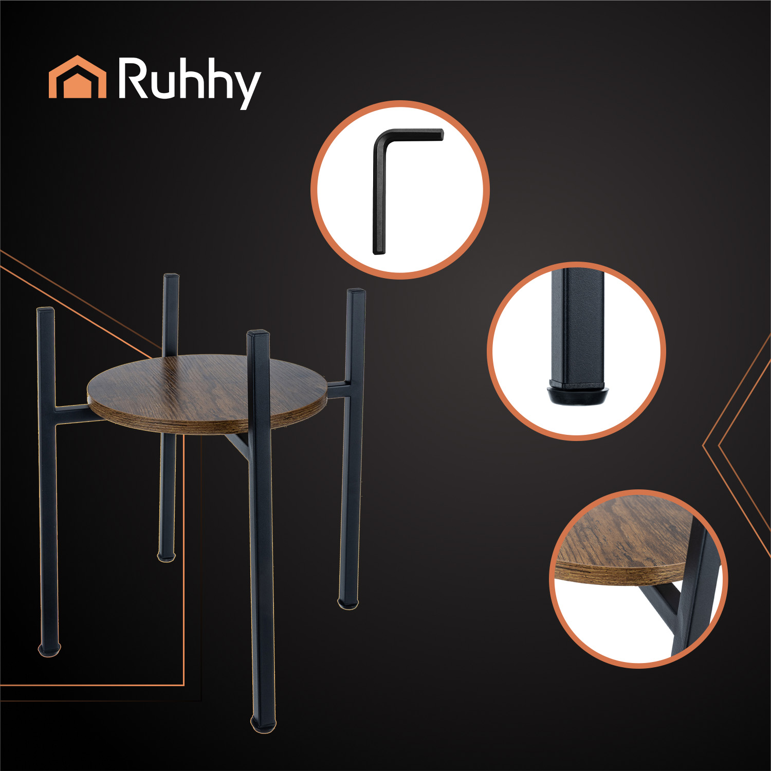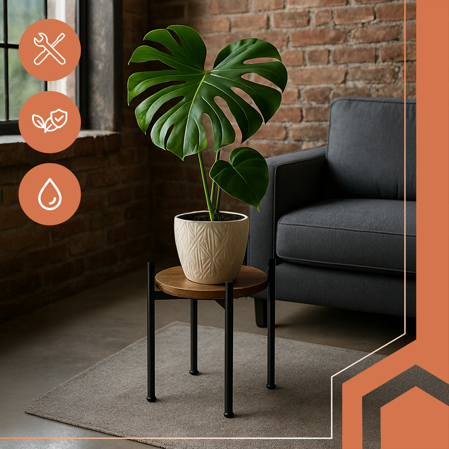 Dzięki solidnej, żelaznej konstrukcji kwietnik RUHHY z łatwością utrzyma nawet ciężkie, ceramiczne donice z kwiatami, ziołami czy dekoracjami. Poziomujące stopki ochronne zapewniają stabilność na każdej powierzchni, chroniąc jednocześnie podłogę przed zarysowaniami. To trwałe i praktyczne rozwiązanie do codziennego użytku w domu i na balkonie.