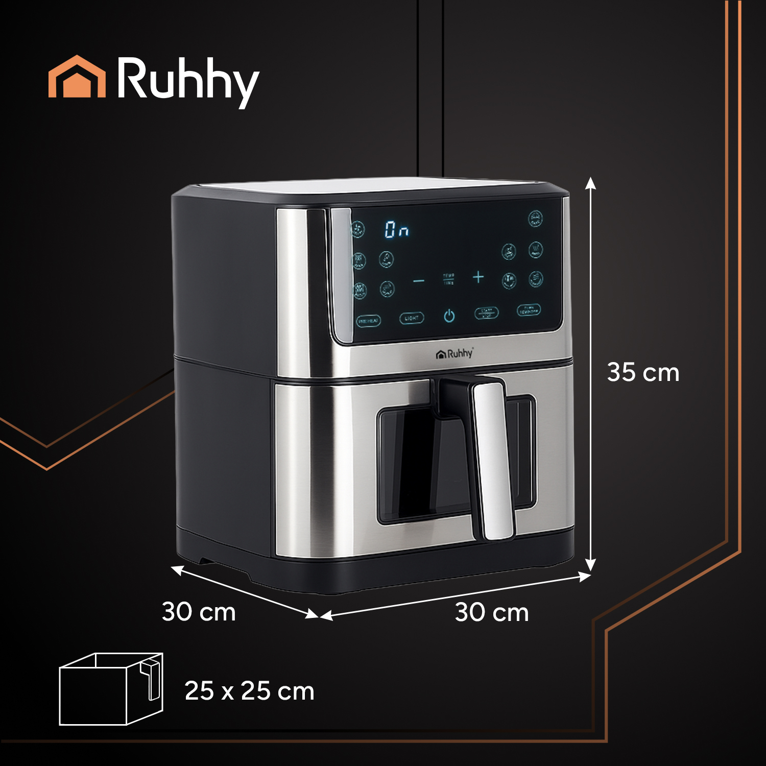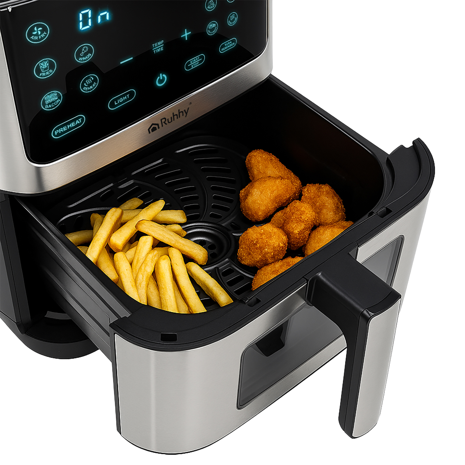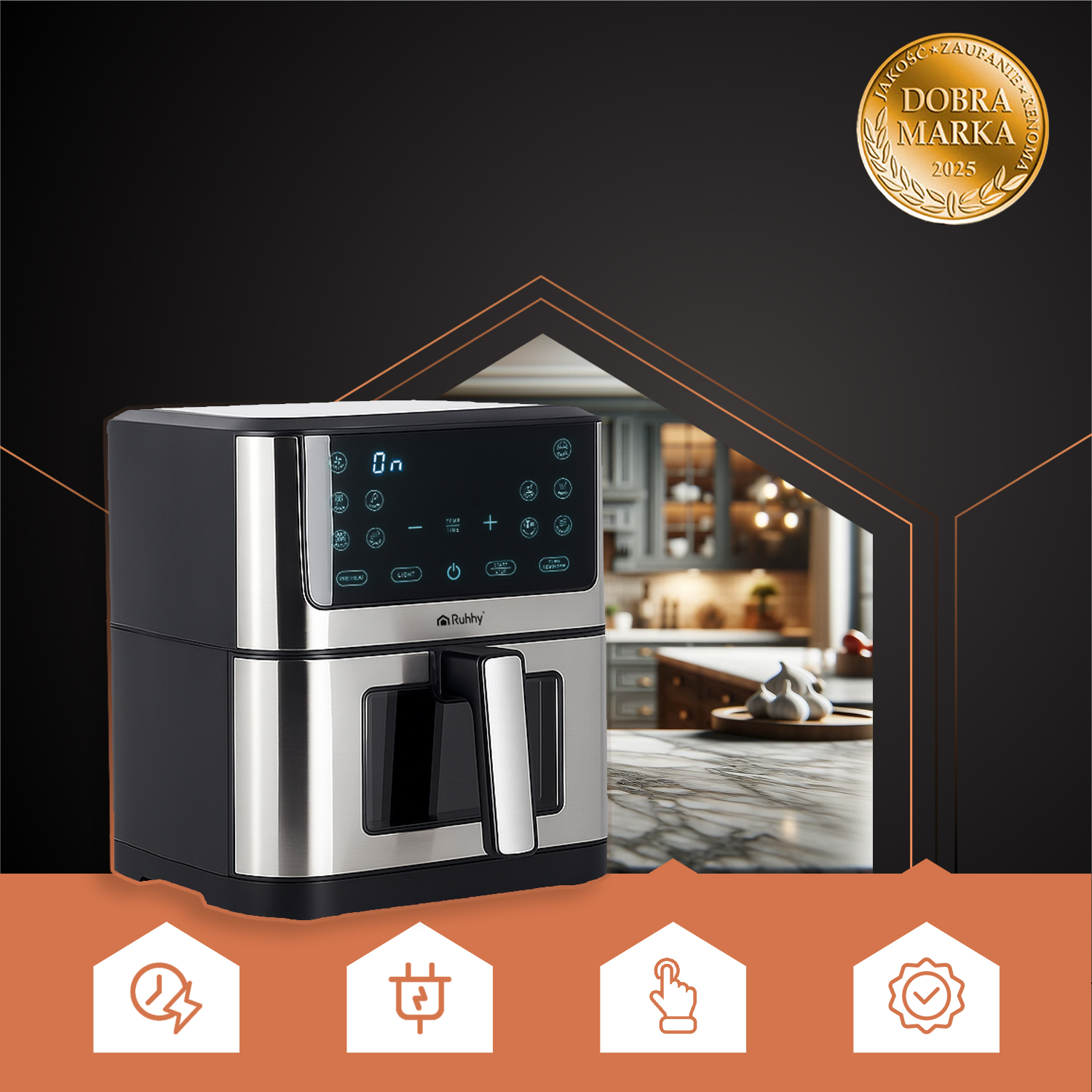 Frytkownica beztłuszczowa AIR FRYER marki RUHHY o potężnej pojemności 8L to idealne rozwiązanie dla miłośników zdrowych i chrupiących potraw. Dzięki technologii cyrkulacji gorącego powietrza przygotujesz frytki, mięsa i warzywa bez grama tłuszczu – szybko, smacznie i wygodnie. Powłoka nieprzywierająca ułatwia czyszczenie, a elegancki design doskonale wpasuje się w Twoją kuchnię.
