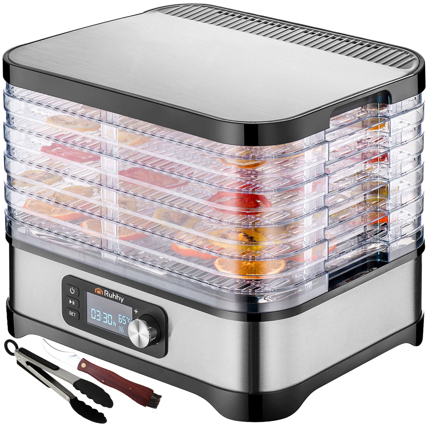 Suszarka RUHHY poza standardowym wyposażeniem w 5 tacek, zawiera aż 2 tacki do płynnych produktów, 2 siatkowe tacki i 2 maty nieprzywierające, co znacząco rozszerza jej możliwości – od suszenia musów, zup i sosów po delikatne zioła. Suszarka do grzybów RUHHY nie ogranicza Cię funkcjonalnością! Ten bogaty zestaw akcesoriów pozwala Ci suszyć niemal wszystko – bez kompromisów i bez dodatkowych zakupów.