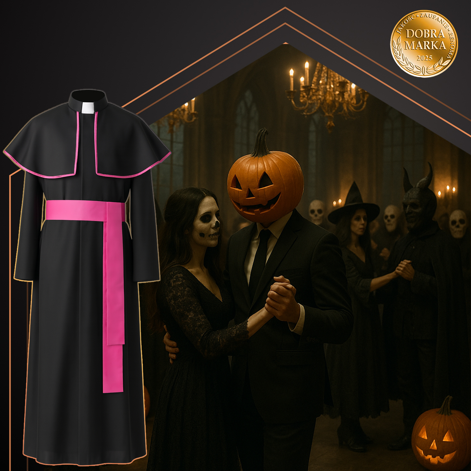 ✴️ klasyczny design inspirowany strojem duchownego – długa sutanna, pelerynka z lamówką i pas tworzą stylizację pełną powagi i wyrazistości