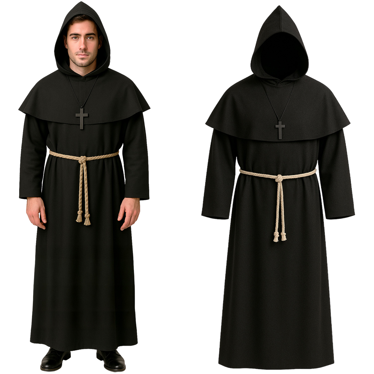 ✴️ autentyczny wygląd – długa, czarna tunika z szerokimi rękawami oraz oddzielnym kapturem tworzy charakterystyczną, skromną sylwetkę zakonnika