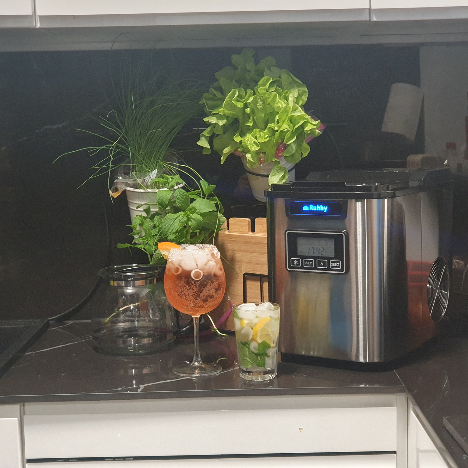 ✓ZEGAR + FUNKCJA USTAWIENIE PROGRAMOWANIA CZASU - kostkarka pokazuje czas rzeczywisty – system 24 godzinny, pozwala regulować go za pomocą migających wskaźników godzin i minut. Następna funkcją jest ustawienie czasowe włączenia kostkarki lodu. Gdy potrzebujesz kostki lodu na daną godzinę, a wiesz że nie będzie Cię wystarczy ustawić timer na daną godzinę i produkcją kostek będzie się odbywała podczas twojej nieobecności. Pamiętaj by wcześniej nalać wodę!
