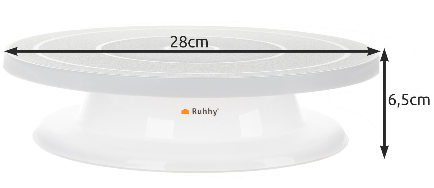 - SPECYFIKACJA – kolor: biały; materiał: PP, pozostałe: TPR + 3 szpatułki do dekoracji ciast PP; średnica nogi: 23cm; wymiary (śr x wys): 28 x 6,5cm; waga: 221g; waga w opakowaniu: 415g.